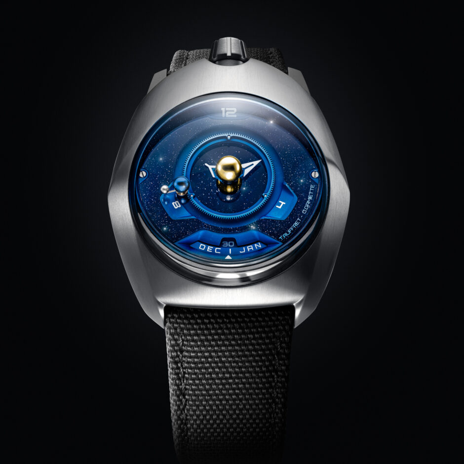 Les aiguilles luminescentes, rappelant les vaisseaux spatiaux, cohabitent avec le Soleil central, marquant l’union entre le temps humain et le temps sidéral. Une approche audacieuse qui bouleverse les codes de l’horlogerie classique.